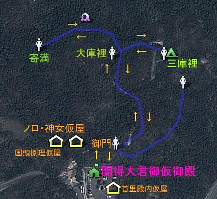 与那原の式典が終わる午後3時頃、斎場御嶽に向かって出発する。大里南風原ノロたちがお供をして磯伝いに知念へすすみ、佐敷境で待ち受ける知念玉城ノロ・神女たちの出迎えを受ける。ここまでは先程の「道ぐゎいにゃ」が謡われる。佐敷から斎場御嶽までの行列にも違ったクェーナが高らかに歌われる。 ♪御新下りクェーナ「みちぐゎいにゃ」 途中の険しい坂で馬からか籠に乗りかえた大君は、午後9時頃に斎場御嶽に到着する。小憩の後に夜半まで式典が行われる。 大君就任の一生に一度の、2日1晩の祭礼のため斎場御嶽には、国頭から捌理らが船で材木を運び祝典の仮宿を造り、ハブの棲まない聖なる久高島から白沙を運び、三大拝初を清め大君の安泰と神聖を祈った。 式典会場は各拝所、仮御殿、仮屋が軒を連ね、大小の傘を30余本も立てられ、ノロ・神女70余名が謡い舞ったという。 |